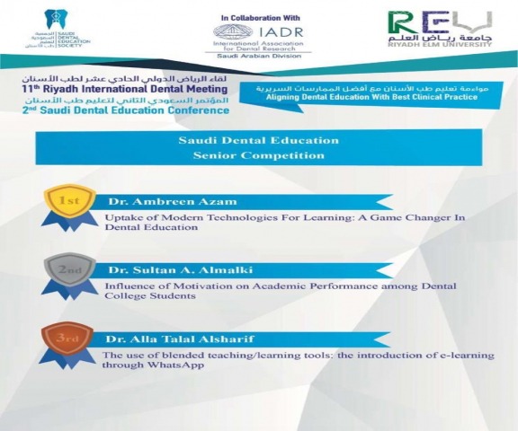 في تألق جديد لمنسوبي جامعة الأمير سطام بن عبدالعزيز حصل سعادة الدكتور سلطان المالكي من كلية طب الأسنان على جائزة وطنية في التميز البحثي من الجمعية السعودية لتعليم طب الأسنان وذلك في منافسة بحثية لفئة كبار الباحثين أثناء انعقاد مؤتمر الرياض الدولي الحادي عشر لطب الأسنان والجمعية السعودية لتعليم طب الأسنان الثاني في مدينة الرياض في الفترة ٢-٤/ ٢/ ١٤٤٠.