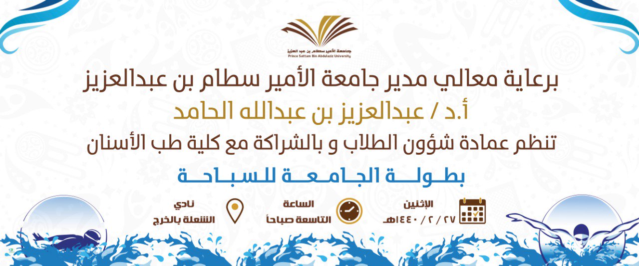 نظمت كلية طب الأسنان وبالشراكة مع عمادة شؤون الطلابصباح الأثنين الموافق 27 / 2 / 1440هـ بطولة الجامعة للسباحة بنادي الشعلة في محافظة الخرج , وبمشاركة ثمان كليات من مختلف كليات الجامعة. حيث حقق المركز الأول في مستوى 50 م حرة الطالب عبدالعزيز سعود المفلح من كلية العلوم بالأفلاج في زمن 38.23ث , والمركز الثاني على سالم الغامدي من السنة التحضيرية في زمن 39.83ث , والمركز الثالث سيف العامري من السنة التحضيرية في زمن 40.05ث , والمركز الرابع فهد ضافي الدوسري من كلية التربية بوادي الدواسر في زمن 40.57.أما على مستوى 50م صدر حقق الطالب الوليد خالد الخنين في زمن 1.00.7 من العلوم الطبية بالخرج , والمركز الثاني فهد ظافي الدوسري من كلية التربية بوادي الدواسر. وفي مستوى50م فراشة حقق المركز الأول الوليد خالد الخنين في زمن 1.01.85ق العلوم الطبية بالخرج , والمركز الثاني فارس على الماضي من الصيدلة في زمن 1.03.61ق. وبهذه النتائج تحقق كلية العلوم والدراسات الإنسانية بالأفلاج لقب البطولة على مستوى كليات الجامعة , والمركز الثاني العلوم بالخرج , والمركز الثالث السنة التحضيرية. توج الطلاب والكليات الفائزة وكيل عمادة شؤون الطلاب للخدمات الطلابية والإسكان الدكتور عبدالله بن سعود الشتيلي وممثل وحدة الأنشطة الطلابية بكلية طب الأسنان د.فيصل بن حيان.