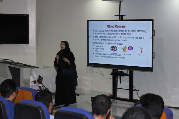 نظمت وحدة تدريب أطباء الامتياز بالتعاون مع وحدة الأنشطة الطلابية ونادي اشراقة محاضرة  بعنوان: (شهر التوعية بسرطان الدم) قدمها سعادة الأستاذة  الدكتورة / سناء محرم كمال  وذلك يوم الاحد الموافق 29/ 09 /2024 م، بقاعة المؤتمرات بالكلية