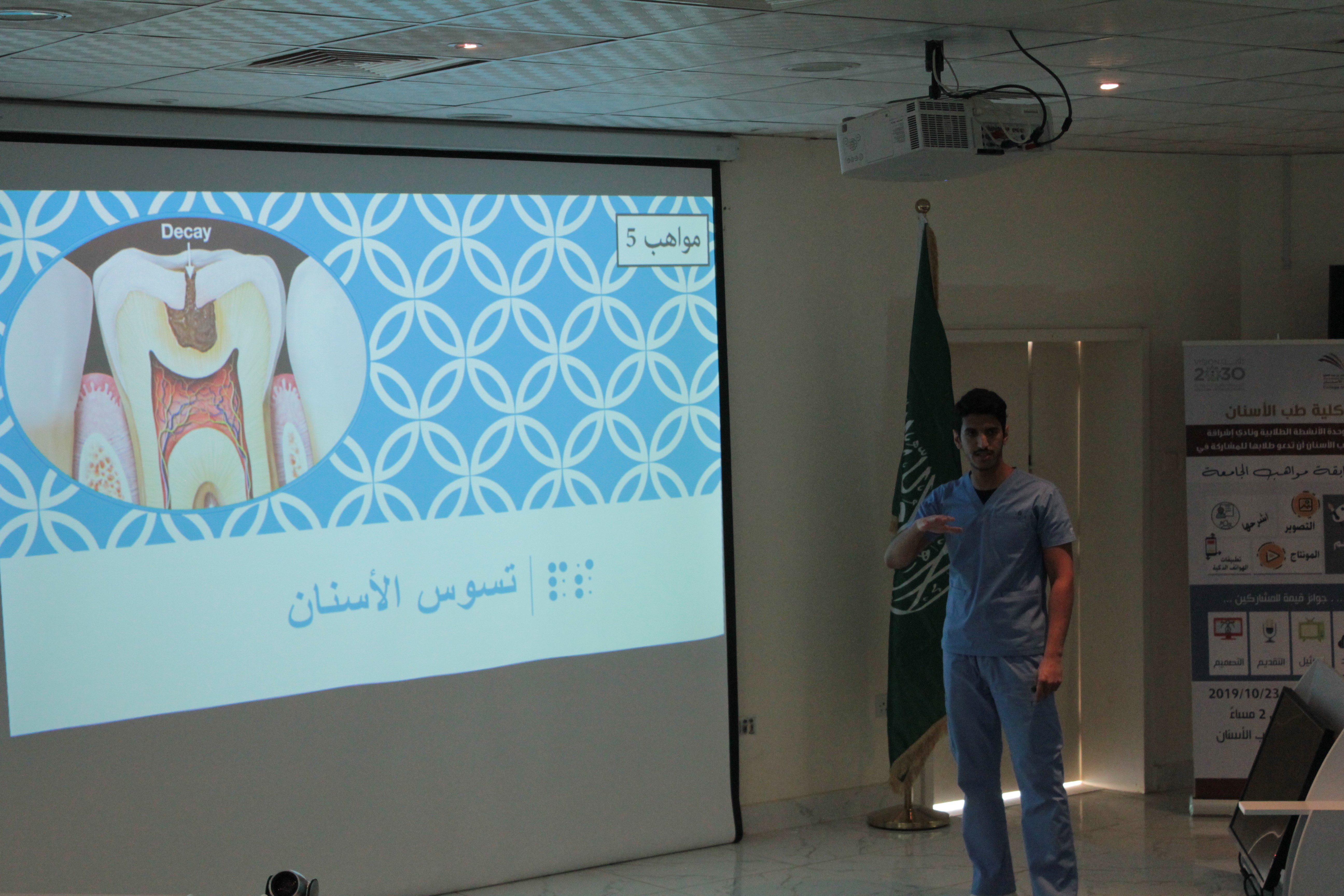 في سعي كلية طب الأسنان لإكتشاف المواهب المتميزة و دعمها، أقامت الكلية بالتعاون مع عمادة شؤون الطلاب مسابقة ( مواهب الجامعة 5) اليوم الاربعاء الموافق 23/10/2019 وذلك بحضور سعادة وكيل الكلية للشؤون الأكاديمية الدكتور ناصر بن راقع القحطاني و لجنة تحكيم من عمادة شؤون الطلاب