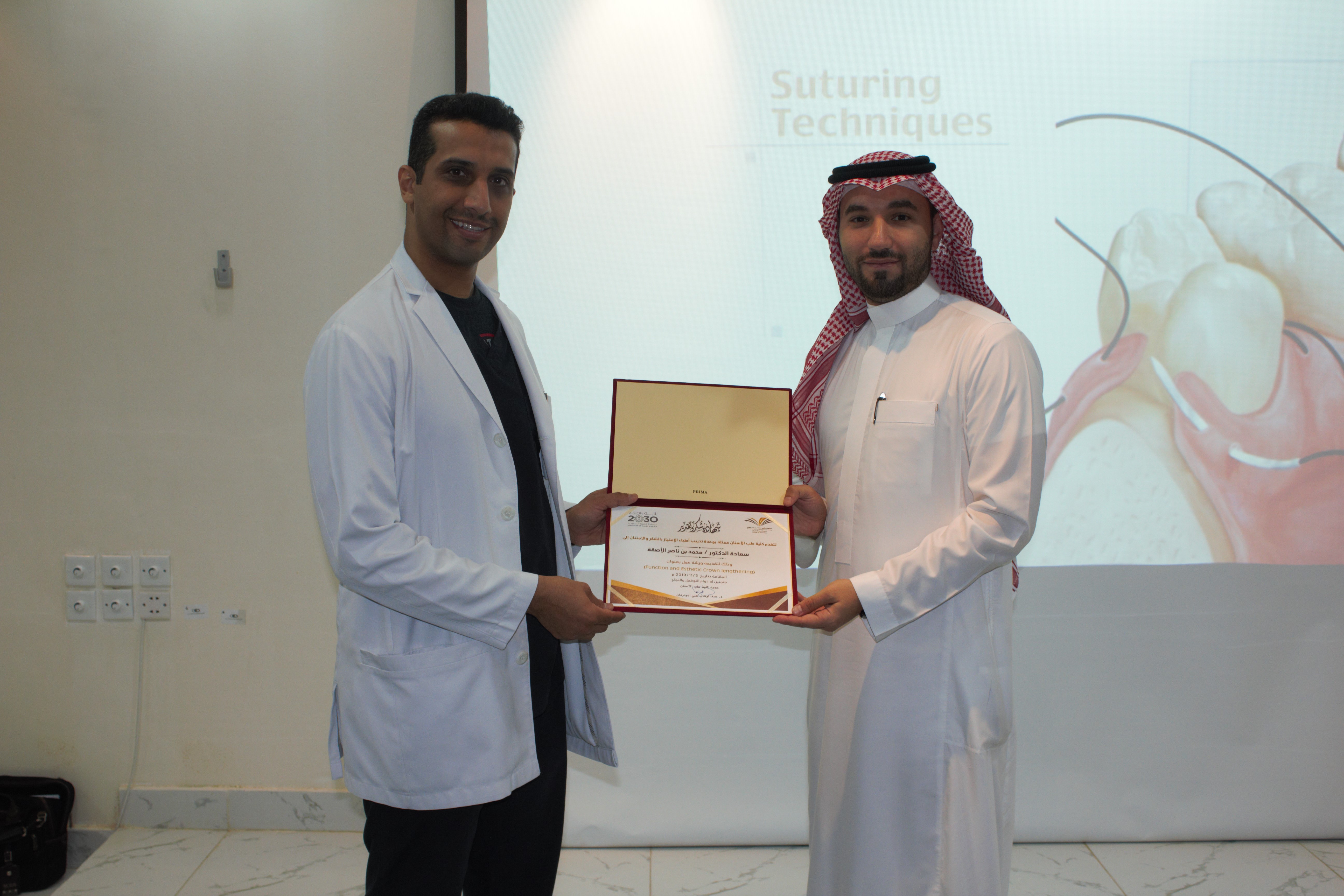 عقدت اليوم الأحد في قاعة المؤتمرات بكلية طب الأسنان ورشة عمل بعنوان : Function and Esthetic Crown Lengthening قدم الورشة سعادة الدكتور :محمد بن ناصر الأصقه الأستاذ المساعد في قسم وقاية الأسنان حيث تأتي هذه الورشة ضمن سلسلة من ورش العمل الهادفة إلى تطوير وتعزيز مهارات الطلاب.