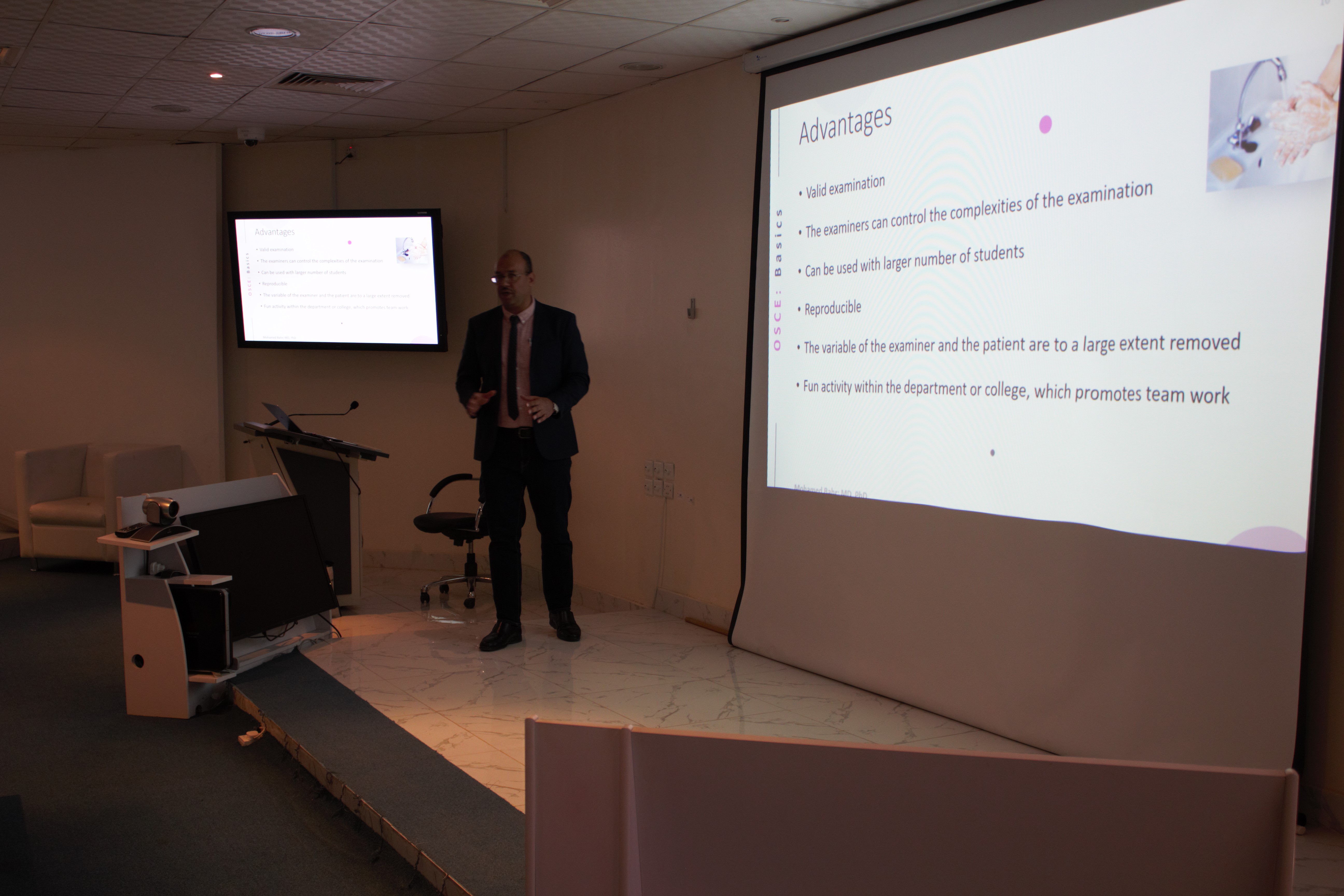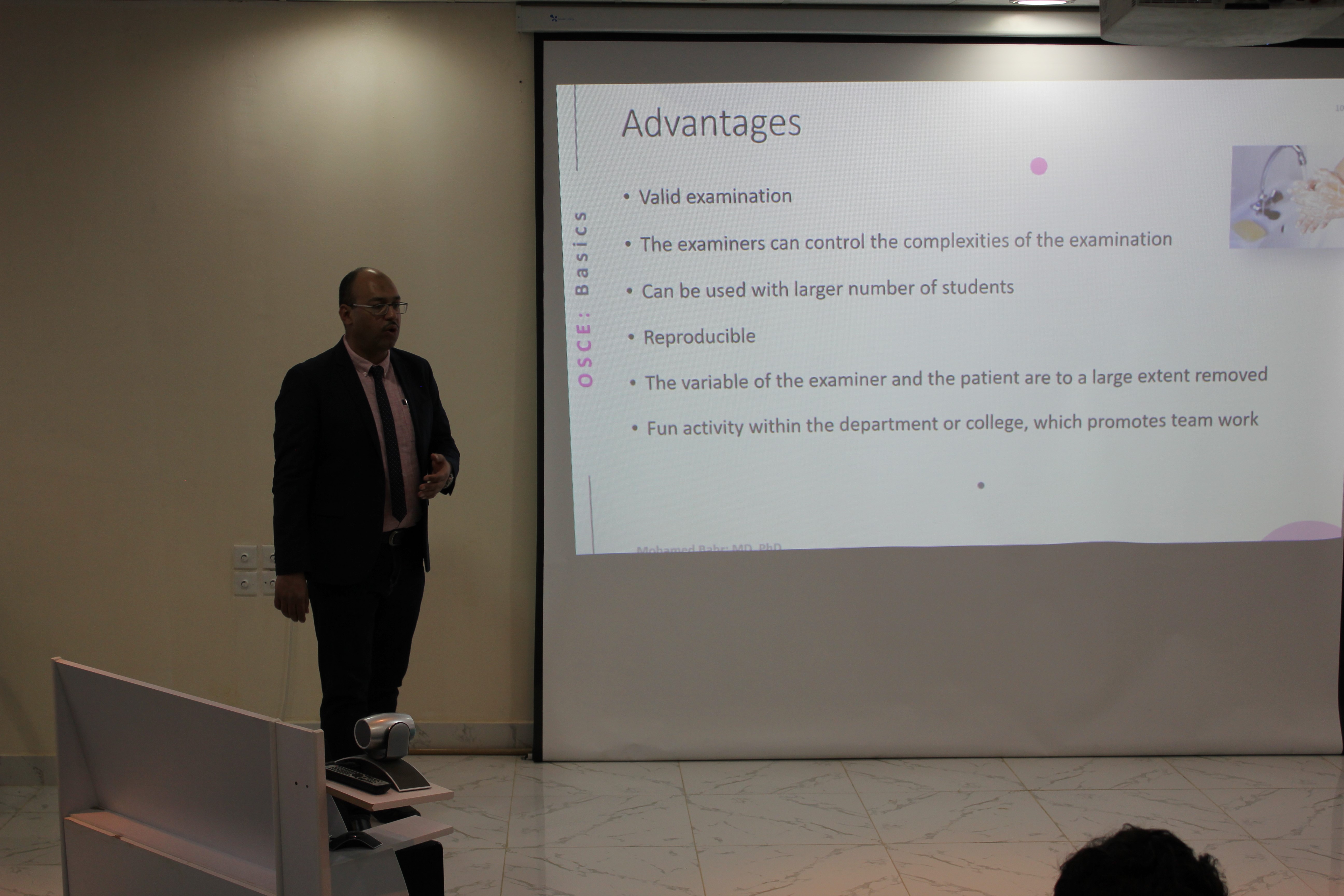 أقامت وحدة تطوير مهارات أعضاء هيئة التدريس والتعليم المستمر التابعة لوكالة الكلية للدراسات العليا والبحث العلمي والجودة ورشة عمل بعنوان: مفهوم وقواعد الاختبارات السريرية المبنية على أهداف (Objective Structured Clinical Examination (OSCE): Concept & Basics ) قدمها سعادة الدكتور / محمد بحر وذلك يوم الأربعاء ١٩ /٢/ ٢٠٢٠م